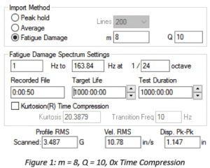 Q값이 작을 경우(Low Q) Damage가 주변 주파수에 퍼진 형태이고 Q값이 높을 경우 (High Q) Damage가 해당 주파수에서 집중 됩니다. 만일 제품에 대한 Q factor 값을 모를 경우 일반적으로 가장 좋은 Starting point는 10입니다. 정확한 Q값을 확인하기위해서는 Sine Sweep을 통해서 Q 값을 찾아야 합니다.