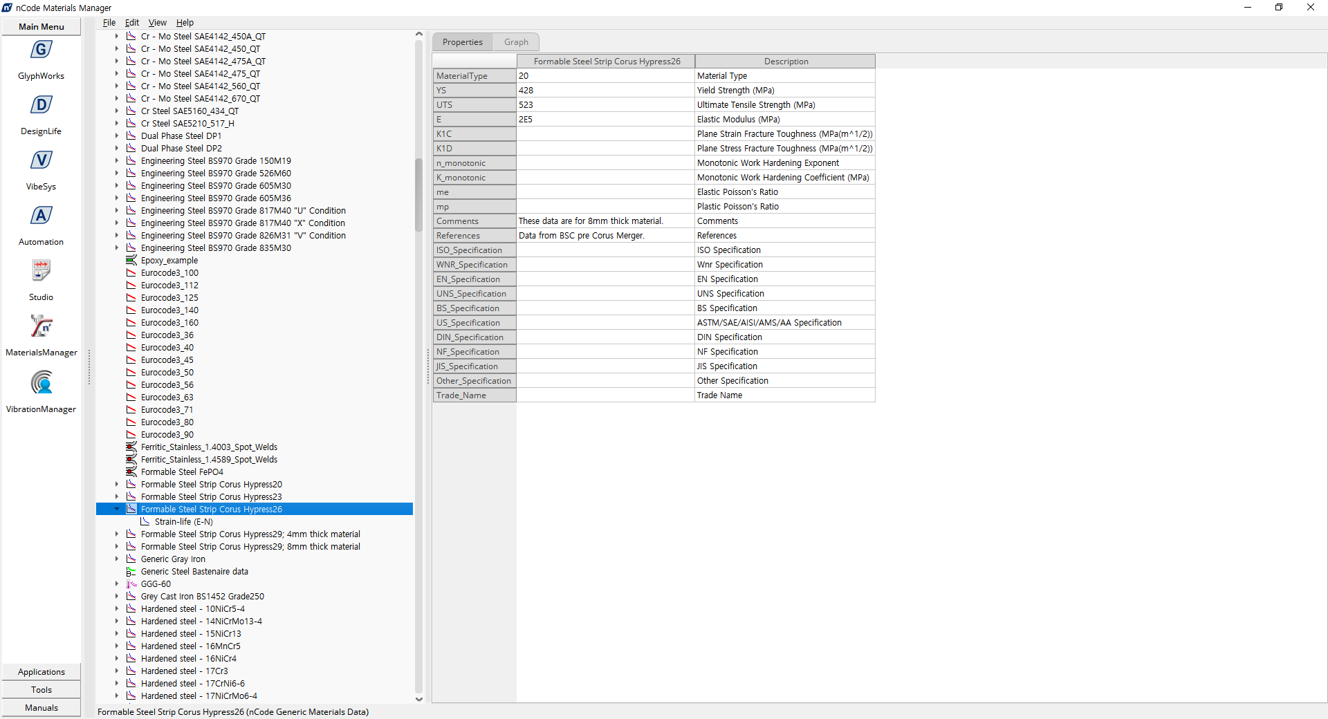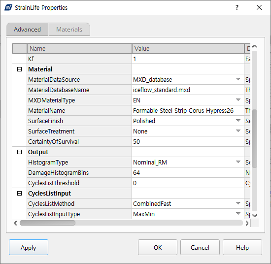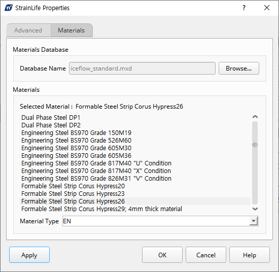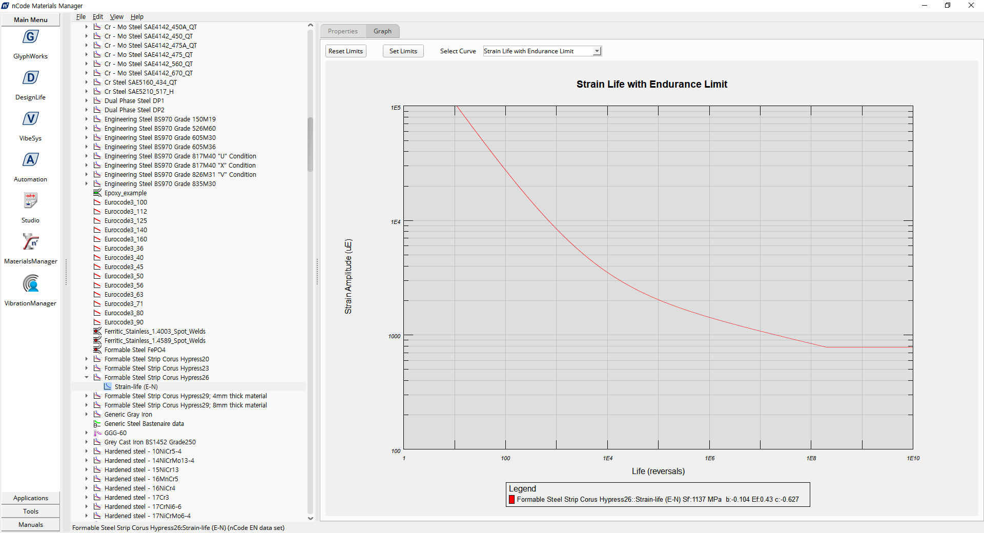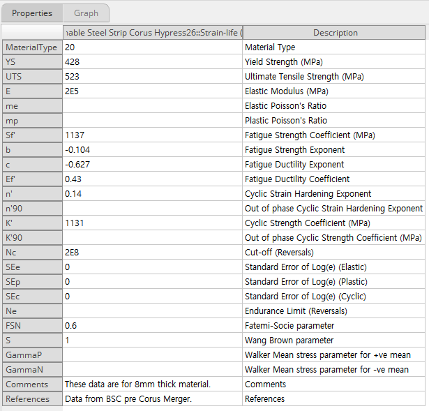 위의 Material 정보는 nCode 회사에서 제공하는 데이터베이스로 nCode DesignLife로 제작도 가능합니다. Material 정보에는 SN, EN Curve의 정보들이 포함되어 있습니다.