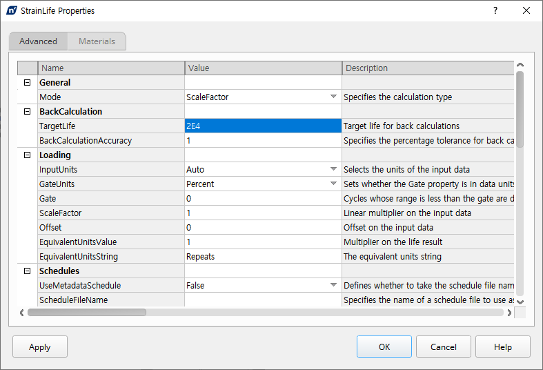 그림과 같이 StrainLife 모듈의 Mode를 ScaleFactor로 설정하고 목표로 하는 TargetLife는 2E4로 설정합니다.