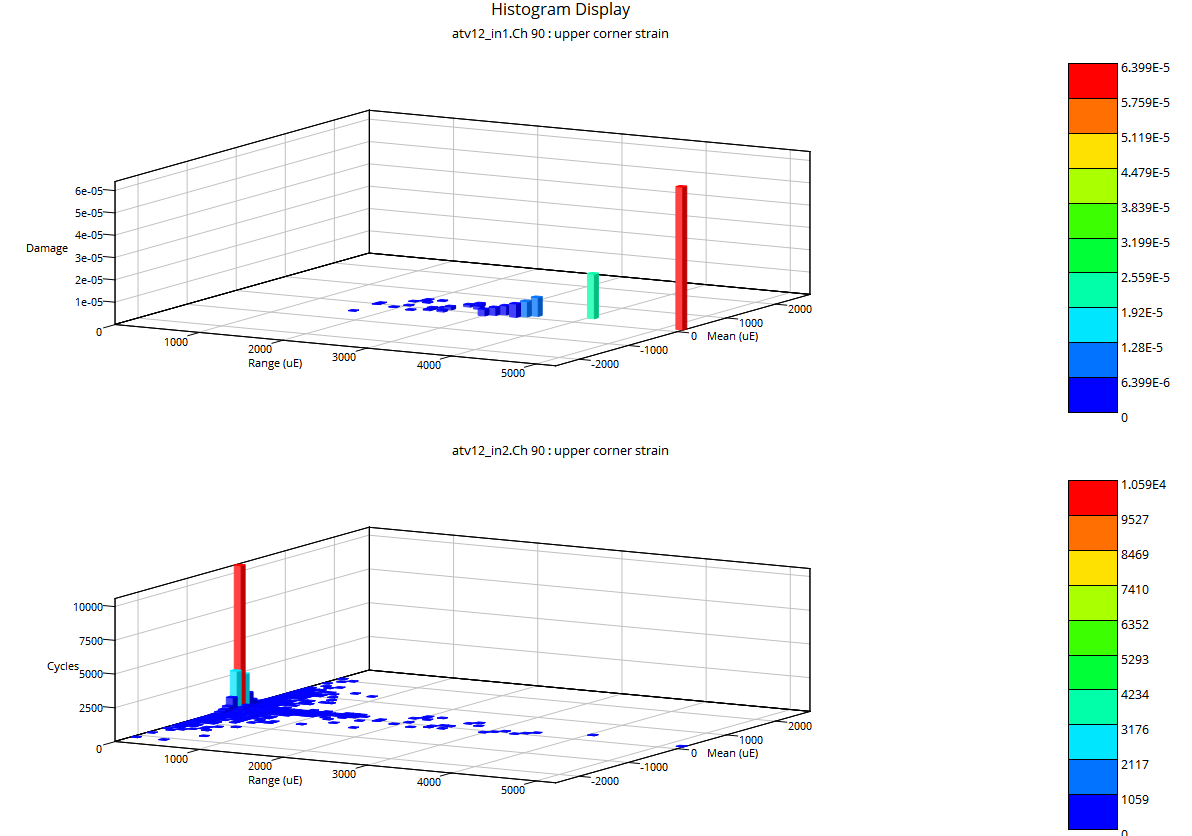 수직으로 올라온 값들이 Rainflow Counting 알고리즘에 의해 계산된 Cycle 수입니다. 가장 많은 사이클 수가 존재하는 위치는 Range와 Mean 값이 0에 가까운 곳에 위치 합니다. 0에 가까운 위치는 Small fatigue cycle이라고 합니다. 피로도 관점에서 큰 영향을 주지는 않습니다. 하지만 오른쪽으로 Range가 갈 수록 Big fatigue cycle이라고 하고 피로도에 높은 영향을 주기 시작합니다.