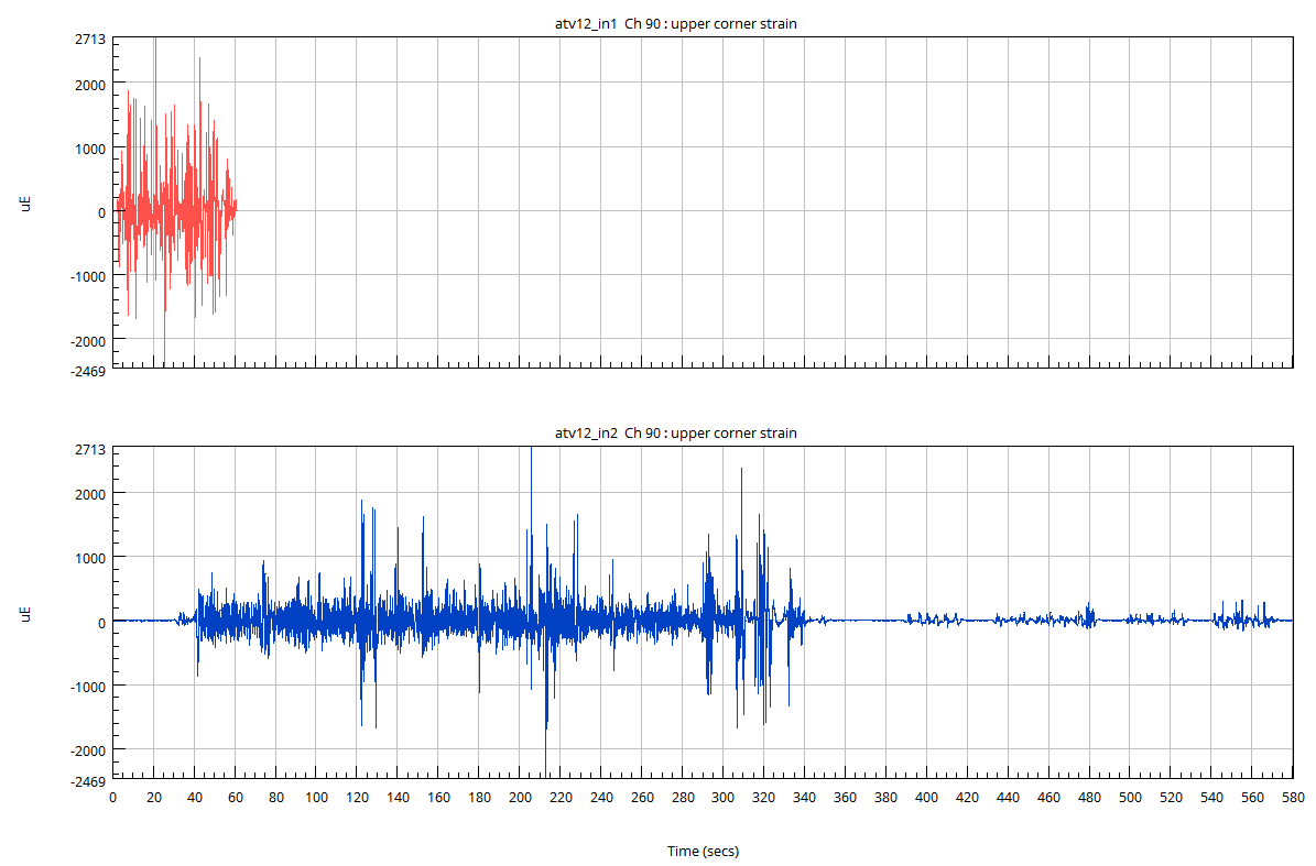 아래 그래프가 최종 결과 그래프입니다. 위쪽 그림이 10%로 줄인 Strain 값이고 아래 그림이 원본 Strain 측정 값입니다. 해당 값은 TSOutput으로 저장해서 실제 시험에서 10%로 줄인 시간으로 시험을 진행할 수 있습니다.