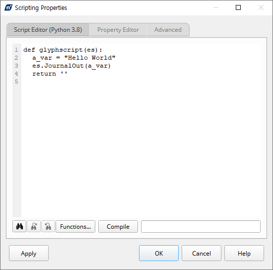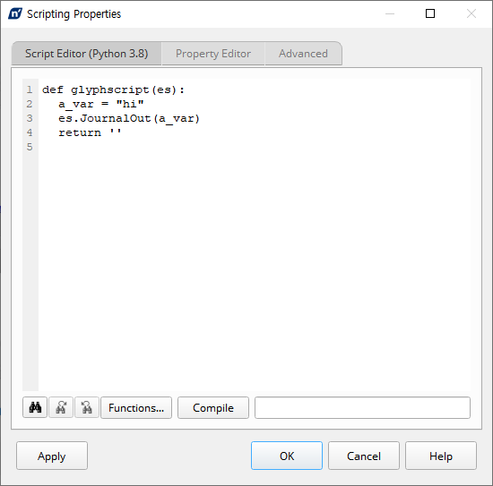 Script Editor 탭에서 원하는 코드를 작성하시고 Compile을 진행하면 됩니다. 파이썬(Python)은 인터프릿터(Interpreter)로 언어를 Compile하는 과정이 없지만 nCode는 다른 모듈과 연동을 위해 Compile로 진행합니다.