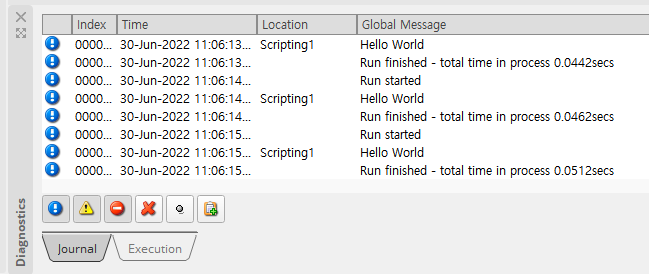 위 예제에서는 JournalOut이라는 내장 method를 사용해서 Diagnostics 윈도우에 출력하게 도와 줍니다.