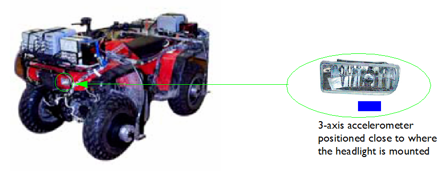 위 그림과 같이 3축 가속도 센서를 ATV 전면 램프 아래에 부착하고 Pothole을 달리면서 가속도를 측정합니다.