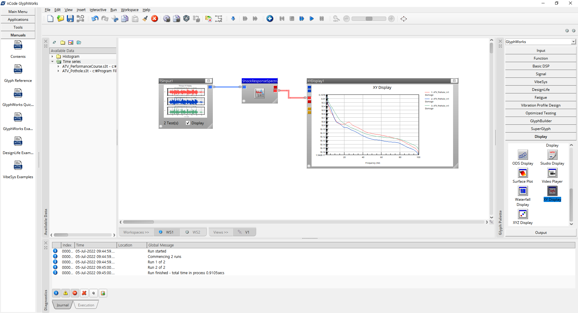 왼쪽 TSInput은 가속도 센서에서 측정한 3축 가속도(Acceleration) 값입니다. 가운데 모듈은 ShockResponseSpectrum으로 앞서 SRS와 동일한 모듈을 사용합니다. 다만 이번에는 출력의 두번째 패드를 사용해서 FDS 값을 받아 옵니다.