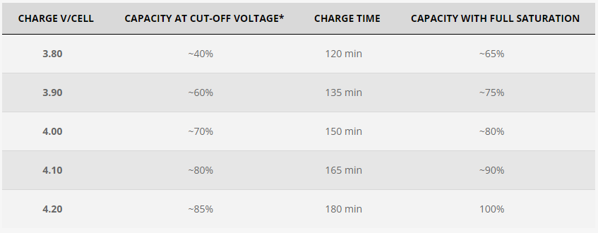 예를 들어 3.8V 문턱전압을 사용하면 Stage1 단계에서 약 40%의 용량을 사용할 수 있고 Stage 2까지 진행해서 완충하면 65%정도 사용 가능하게 됩니다. 여기서 Charge Time은 Stage 2의 완료까지의 시간입니다.