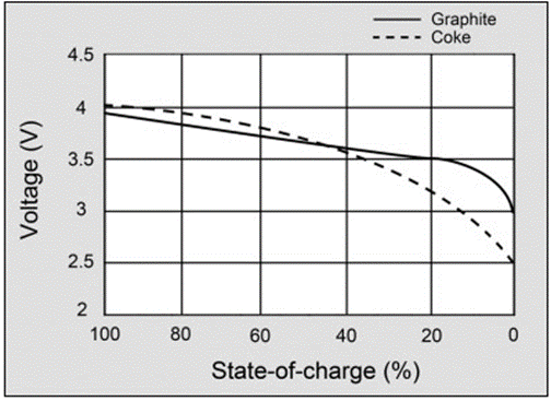 위 그림은 음극제로 코크스가 쓰일 때와 흑연이 쓰일 때 전압 방전 곡선을 보여줍니다.