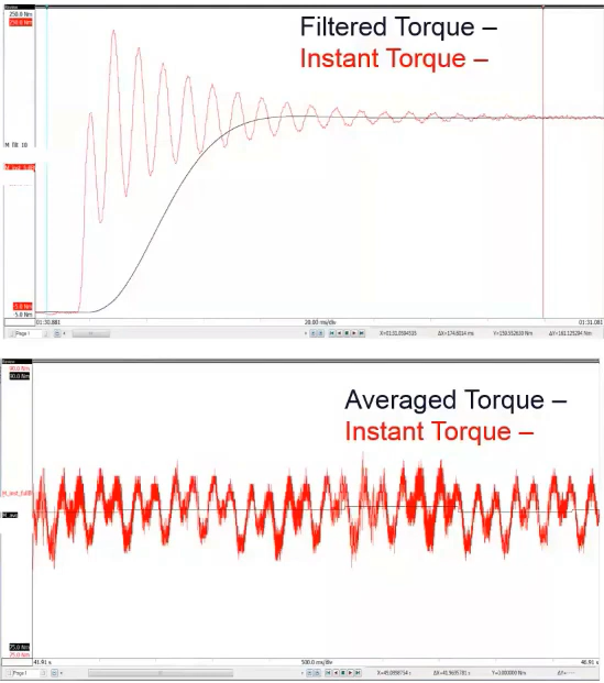 위 그림은 Dynamic Load에서의 토크를 측정한 값입니다. 위쪽 그림을 보시면 일정 시간 후 Torque가 안정 됩니다. 안정된 토크를 확대해서 확인한 그림이 아래쪽 그림입니다. 아래 쪽 그램에서 Instant Torque에서 Ripple과 같은 현상을 확인할 수 있습니다.