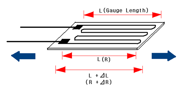 스트레인 게이지란 저항 소자의 길이 변화율(변형율)과 저항 변화율이 비례하는 특성을 이용하여 응력을 측정하는 센서입니다.
