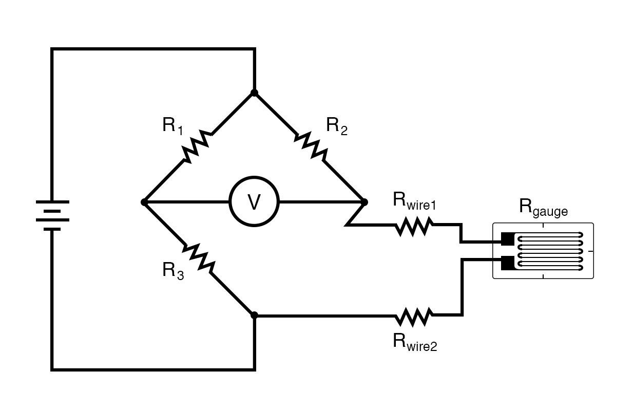 위 그림과 같이 3선 식으로 연결을 하게 되면 R2+Rwire1과 Rgauge+Rwire2의 비로 계산되고 동일 온도에 영향을 받는 Rwire1, Rwire2는 서로 보상되어 상쇄됩니다. 그러므로 위와 같은 구성으로 회로를 만들면 온도에 대한 영향을 2선식에 비해 덜 받게 됩니다.
