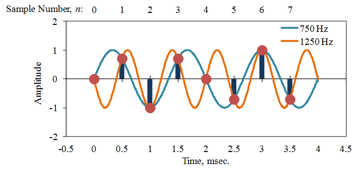 위 그림은 750Hz 신호와 1250Hz 신호를 2000Hz 샘플레이트로 포인트를 가져왔을 때 두 신호가 디지털 화면에서는 동일하게 찍혀서 원신호를 복원하지 못함을 보여 줍니다.
