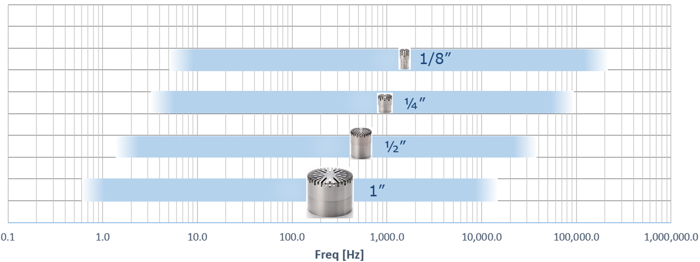 일반적으로 마이크로폰을 정면 부분의 원의 직경을 통해 크기를 구분합니다. 팜테크에서 판매하는 GRAS 제품의 경우 직경을 인치(Inch) 단위로 구분 합니다. 직경이 큰 경우와 작은 경우의 특성이 명확하게 구분되는 데 아래와 같이 구분 지을 수 있습니다.