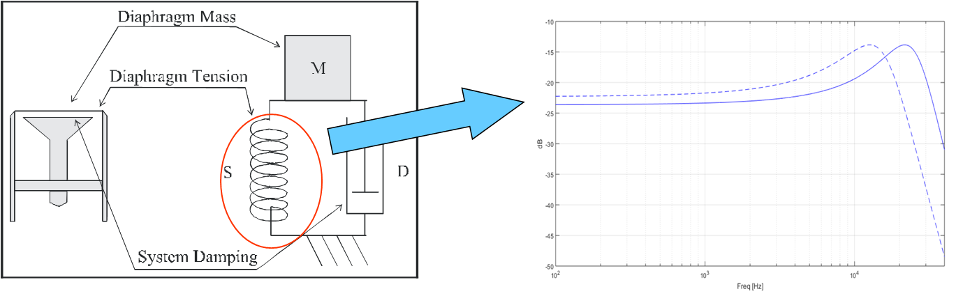 그림과 같이 Diaphragm의 Tension을 낮출 경우 사용할 수 있는 공진점이 낮아지고 감도(Sensitivity) 값은 높아지게 됩니다.