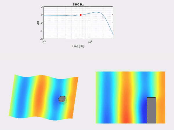 위 그림은 동일 음압으로 소리가 진행되어도 주파수에 따라 측정값이 변화하는 과정을 보여 줍니다. 주파수가 증가함에 따라 하단의 이미지를 통해 회절(Diffraction)이 발생함을 알 수 있습니다.