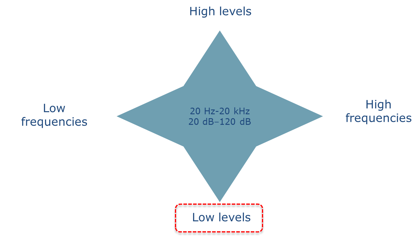 위 그림과 같이 기본적인 마이크로폰의 주파수와 측정 범위는 20~20KHz, 20~120dB 정도 입니다. 저레벨(Low Level, dB) 영역의 측정과 이때 어떠한 마이크로폰을 이용하는 지에 대해 알아보겠습니다.