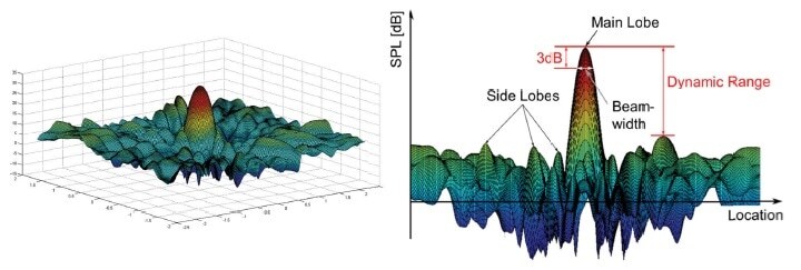 사운캠의 위치에 따른 측정 SPL(Sound Pressure Level)은 위 그림과 같이 Main Lobe와 Side Lobes로 구성 됩니다. Dynamic Range에 대한 정의는 Main Lobe와 Side Lobe의 가장 높은 값의 차이를 의미합니다.