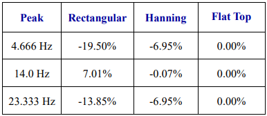 다음 표는 Flat Top 윈도우를 기준으로 다른 윈도우의 Peak 값을 제공합니다. 누유로 인한 Peak의 증가와 감소치를 확인할 수 있습니다.