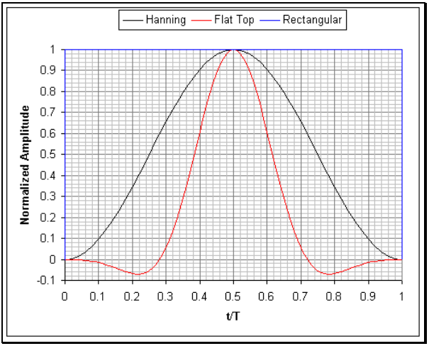 Hanning 과 Flat Top 윈도우 필터와 비교하여, Rectangle 윈도우는 사이드 로브 진폭이 가장 높고 중앙 로브에 가장 큰 곡률을 갖습니다.