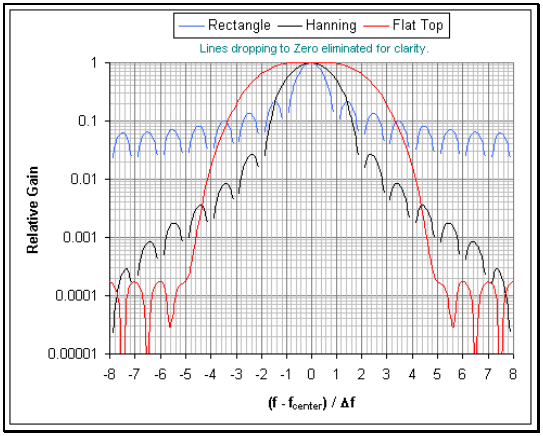 하지만 Hanning 윈도우는 중앙 로브가 더 넓어져서 가장 가까운 제로 지점 사이에 4개의 Δf가 있습니다. Hanning 윈도우를 사용하면 톤의 주파수 해상도가 감소됩니다.