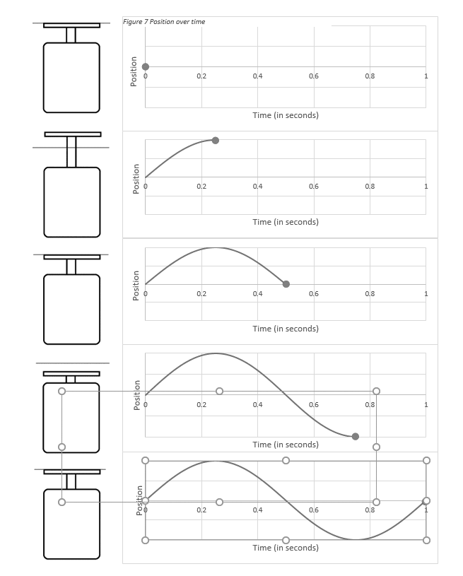 예를 들어, 1 Hz에서 단일 주파수 사인 테스트를 실행하면 시험기의 움직임은 위 그림과 유사합니다. Shaker의 헤드는 1초 동안 한 주기를 완료합니다. 마찬가지로 500Hz에서 단일 주파수 사인 테스트를 실행하면 Shaker는 1초에 500주기를 완료합니다.