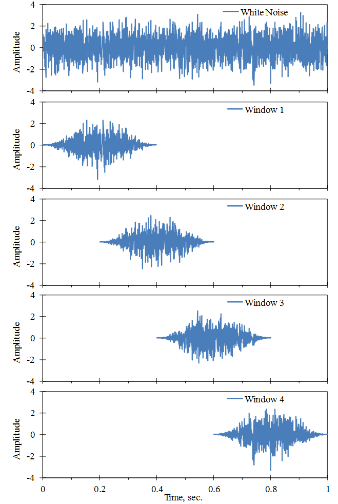 위 그림은 백색소음(White Noise)를 0.2초로 조각을 내어 각 조각에서 PSD를 가져와서 평균화 작업을 진행하는 과정을 보여 줍니다.