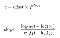 주파수 f1에 a1 점과 f2의 a2 점의 기울기를 구할 때 제곱 수식(Power Relationship)을 사용해서 아래와 같이 구할수 있습니다.