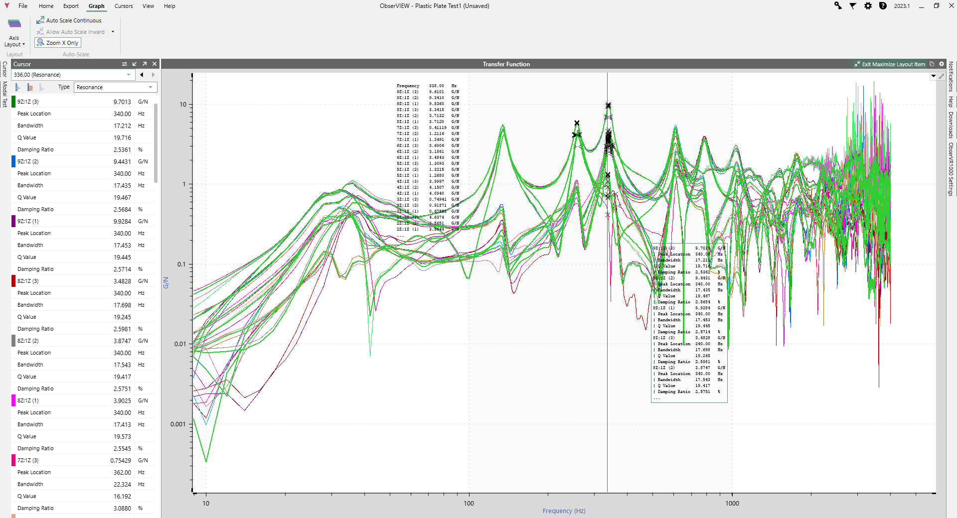 - Transfer Function 함수에서 Resonance Cursor를 사용해서 공진점 및 Q factor, Damping Ratio, Bandwidth를 확인할 수 있습니다.