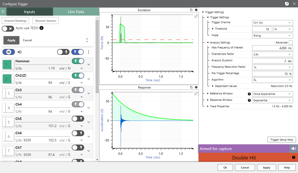 1. 그림과 같이 Ch1에는 Impact Hammer 센서의 감도와 전원을 설정하고 Ch2에는 가속도 센서 Z축에 대한 감도와 전원을 설정해줍니다.