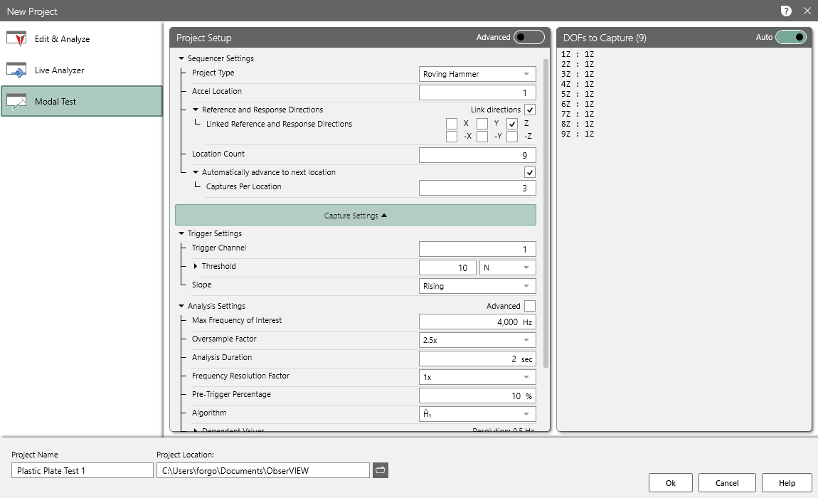 3. 위 그림1과 같이 ObserVIEW 소프트웨어에서 임팩트 해머 시험을 위해서 설정 값을 위와 같이 입력해줍니다. 시험의 편의성을 위해 Roving Hammer 시험을 진행할 것이고 단축(Z축)에 대한 응답 만을 측정 합니다.