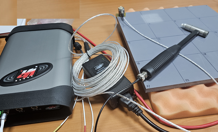 위 그림은 Impact Hammer로 모달 분석하는 시험 사진입니다. 측정에 사용한 제품은 팜테크 사에서 판매 중인 ObserVR1000, 가속도센서와 PCB사의 Impact Hammer입니다.