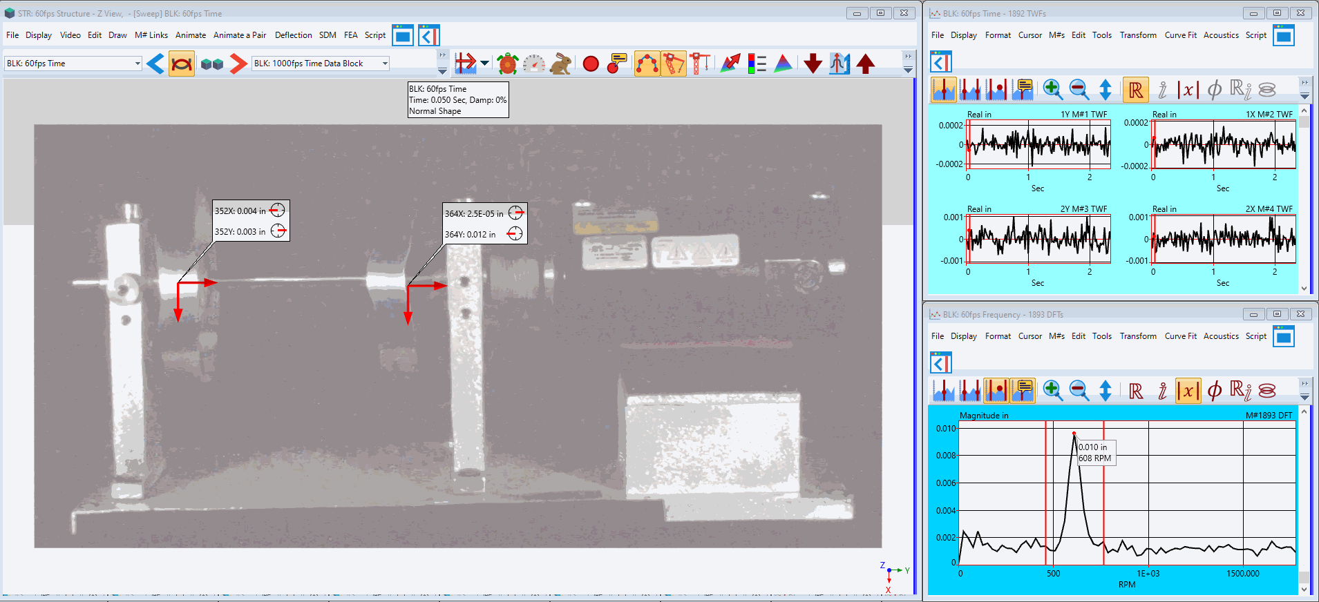 2. 시간 및 주파수 기반 ODS 분석: VES-9000은 각 지점의 수평 및 수직 변형 시간파형을 추출하여 데이터 블록에 표시합니다. 또한 디지털 푸리에 변환(DFT)을 계산하고 별도의 데이터 블록에 표시합니다. 이를 통해 시간 및 주파수 기반의 운동 특성을 체계적으로 분석할 수 있습니다.