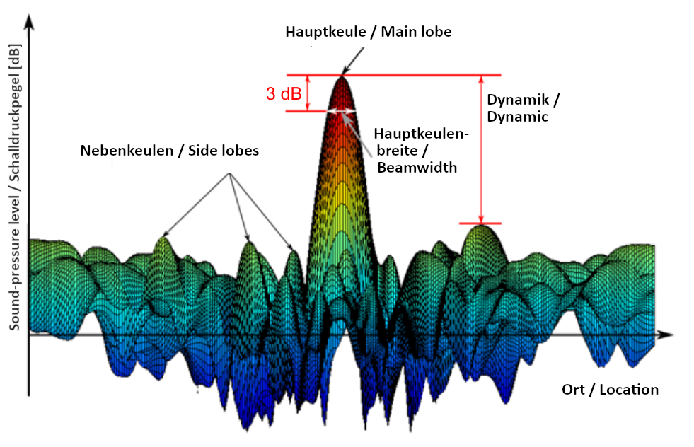2. 사이드 로브(Side Lobes): 옆 노브는 주요 노브 이외에 나타나는 작은 뾰족한 부분들을 의미합니다. 이 부분들은 시스템 내부에서 생기는 여러 가지 영향으로 인해 나타납니다. 주로 원하지 않는 방향에서 소리를 포착하는 경우에 해당합니다. 해당 값은 실제 음압이 발생하는 지점이 아니기 때문에 장비나 소프트웨어 처리 기술로 Dynamic Range를 최대한 높여서 잘못된 음원을 매핑하는 것을 피해야 합니다.