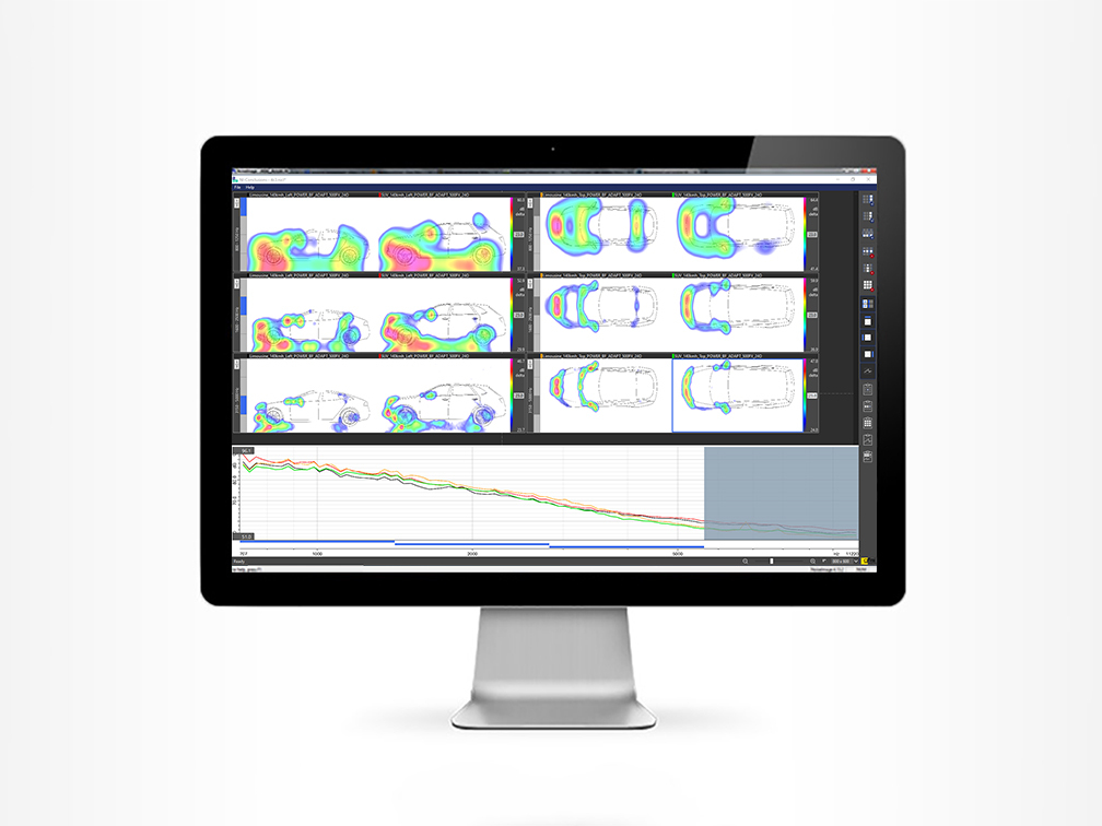 위 그림은 팜테크에서 제공하는 Gfai 사의 2D 음향 카메라 분석 화면입니다. 사용된 예는 차량의 소음을 시험하기 위해 Wind Tunnel에서 차량에 바람을 강제시키고 발생하는 소음을 시각화한 화면 입니다. 이처럼 정확한 소음원을 분석하기 위해서는 분석하고자하는 음압의 크기와 주파수 영역 그리고 소음원을 정확히 구분지을 수 있는 Dynamic Range에 대한 증폭 알고리즘이 필요 합니다.