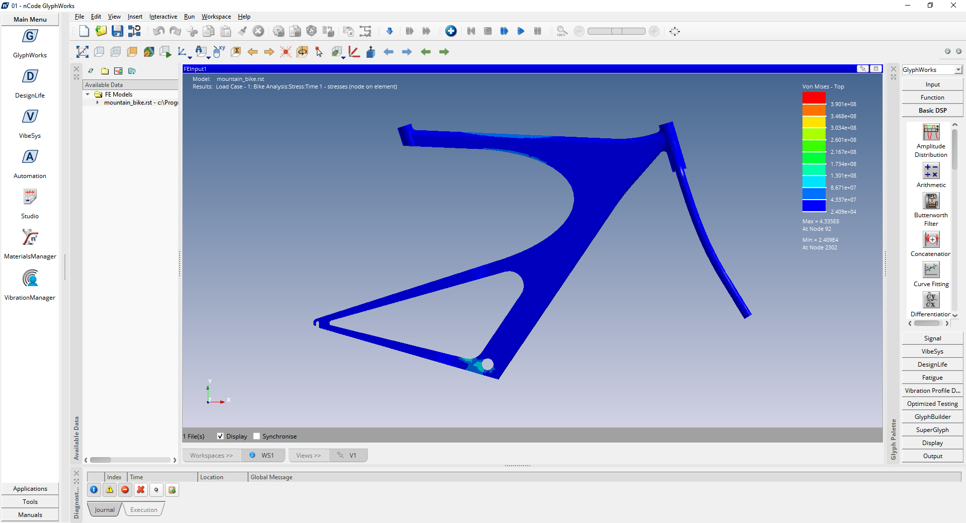 위 화면은 팜테크에서 제공하는 nCode DesignLife 소프트웨어 화면 입니다. 입력 값은 자전거 거치대 파트를 Ansys 툴을 사용해서 FEA 분석을 진행하였고 해당 값을 nCode에서 출력한 것입니다. Von Mises를 이미지로 시각화 해서 Magnitude 정보를 알려줍니다.