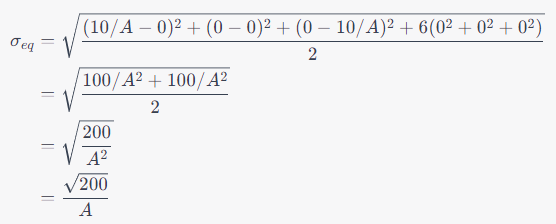 이렇게 계산한 폰 미세스 등가 응력은 단면적 A에 반비례하는 값으로, 막대의 단면적이 작을수록 응력이 증가합니다. 이 값은 막대가 어떤 조건에서 파괴될 가능성이 있는지를 평가하는 데 사용됩니다.