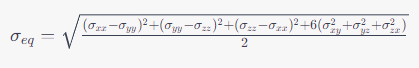 이제 폰 미세스 등가 응력을 계산해보겠습니다. 3차원 응력 텐서는 주로 6개의 구성 요소로 표현됩니다.