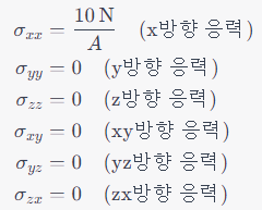 xx, yy, zz, xy, yz, zx 방향의 응력 구성 요소입니다. 이들 응력 요소들은 힘, 길이, 단면적, 재료 특성 등에 따라 계산됩니다. xx, yy, zz는 Normal Stress이고 xy, yz, zx는 Shear Stress입니다.