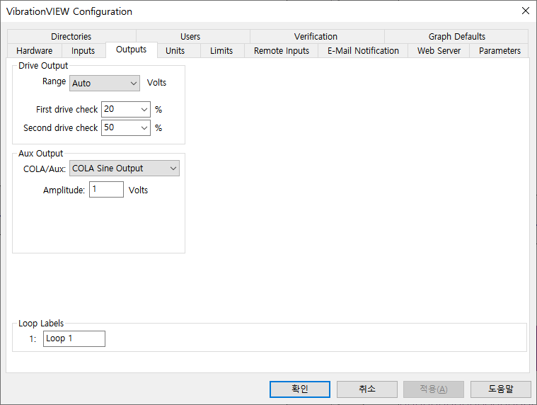 5. Configuration - Output에서 COLA Sine Output으로 설정 하고 1Volt를 넣습니다.
