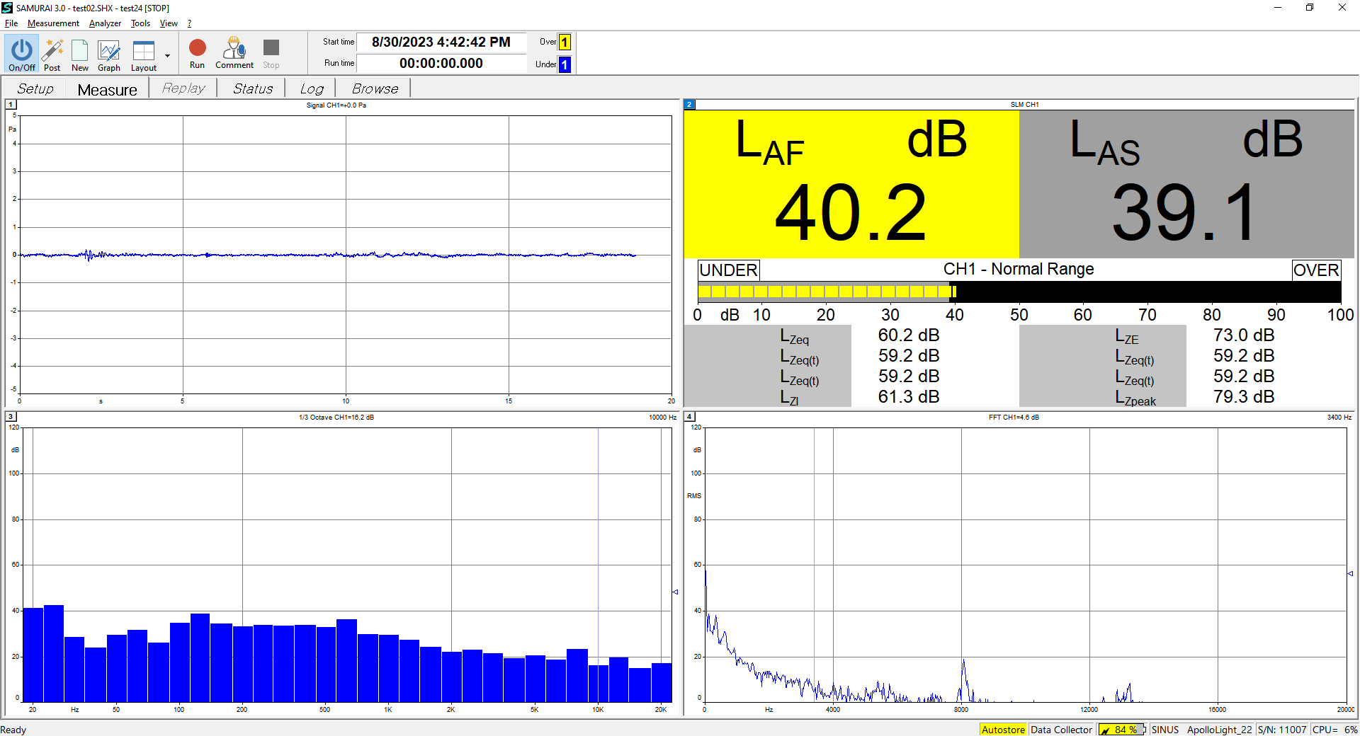 위 그림은 팜테크에서 제공하는 SINUS APOLLO Lite로 측정한 소음의 결과 화면 입니다. 측정은 GRAS사의 마이크로폰(Microphone) 센서를 사용해서 진행하였습니다.
