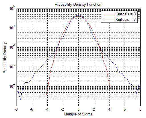 만약 Kurtosis의 값이 3보다 크다면, 데이터 분포는 뾰족한 정규 분포보다 뾰족하며, 꼬리 부분이 길어진다는 의미입니다. 반대로, 값이 3보다 작다면, 데이터 분포는 뾰족한 정규 분포보다 더 납작하며, 꼬리 부분이 짧아진다는 의미입니다. 위 그림과 같이 3일때는 일반적인 정규 분포 형태의 확률 밀도 함수 그림이지만 7로 증가할 경우 중심에서 벗어난 값의 크기가 커지게 됩니다.