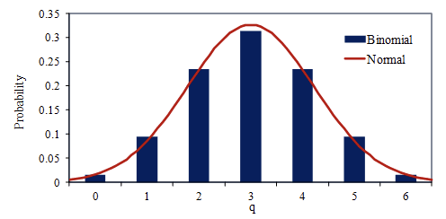 여기서 P(q)는 q번의 앞면이 나오는 확률을 나타냅니다. 이 확률 분포를 이항 분포(Binomial distribution)라고 합니다. 그런데 중심극한정리에 따르면, N번의 동전 던지기를 여러 번 반복하고 그 합을 구한다면 이 분포는 N이 커질수록 정규분포와 유사해집니다. 아래는 N=6일 때, 이항 분포와 정규분포를 비교한 그림입니다.