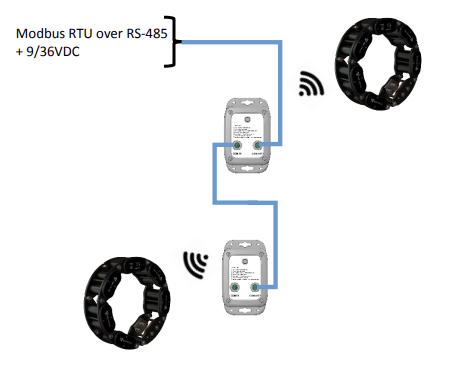 Torque Trak Revolution은 그림과 같이 스트레인 게이지(Strain Gauage)와 연결됩니다. 측정된 RPM와 Torque는 무선 통신을 통해 전송되고 Receiver에서는 측정한 값을 Modbus 프로토콜을 사용한 통신 방식으로 컴퓨터에 전송해줍니다.