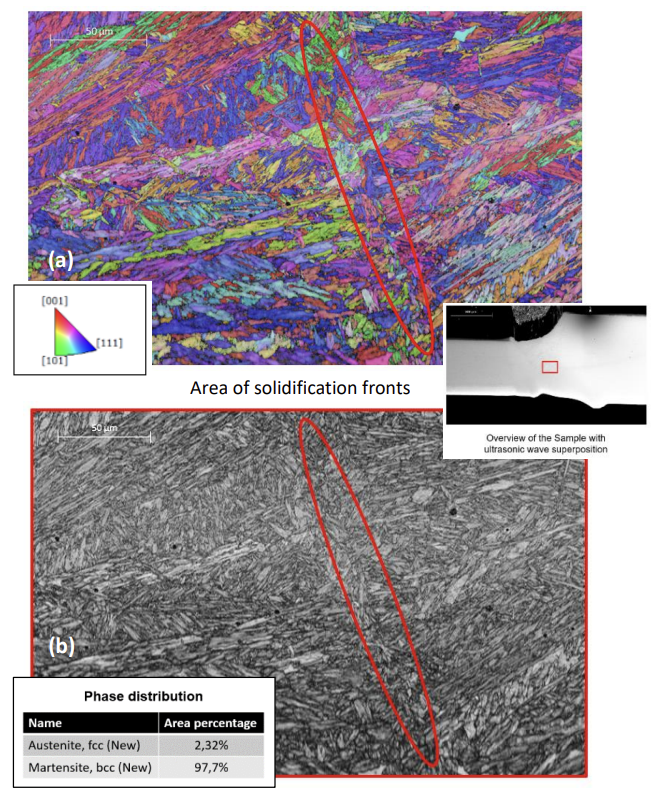 - 마르텐사이트 형성 증가: EBSD(Electron Backscatter Diffraction) 측정 결과에 따르면, 초음파 파동 중첩을 사용하여 생산된 용접 이음매에서는 높은 비율의 마르텐사이트 단계와 낮은 비율의 오스테나이트가 형성됩니다.