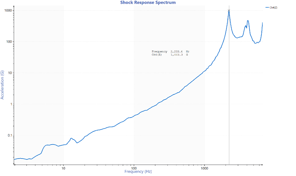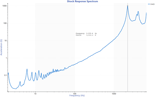 충격 펄스의 충격 응답 스펙트럼(SRS)을 보면, 최대 가속도가 FFT(고속 푸리에 변환)에서의 최대 주파수 값과 일치하는 것을 볼 수 있습니다. 그러나 이 주파수 구간에 대한 최대 가속도는 1,000G를 조금 넘습니다.