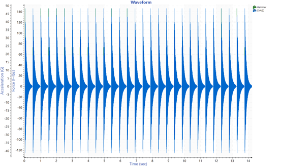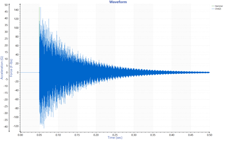 위 그림은 충격파를 시간 도메인에 따라 팜테크에서 제공하는 ObserVIEW로 저장한 값입니다. 단일 충격 펄스 파형은 모달 해머(Impact Hammer)로 시험 대상체를 치면서 생성되었고, 가속도계가 응답(Ch4(Z))을 기록했습니다.