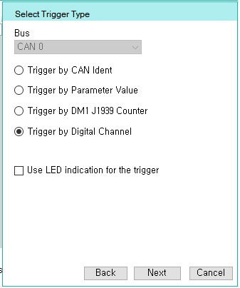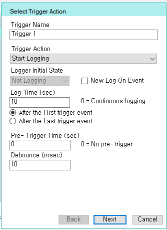 5. 아래와 같이 Digital Channel을 통해 이벤트를 인식합니다. 1번 과정에서와 같이 채널에 Digital 값을 넣지 않으면 Digital 채널 트리거 선택이 활성화 되지 않으니 주의 하셔야 합니다.