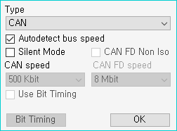 2. 캔 Log 설정은 아래와 같이 Auto detect로 속도를 찾고 Standard CAN을 설정합니다. 이는 이번 실습에서 사용되는 아두이노 CAN이 Standard에 500kbps로 전송되기 때문입니다. 속도 값은 직접 설정도 가능 합니다.