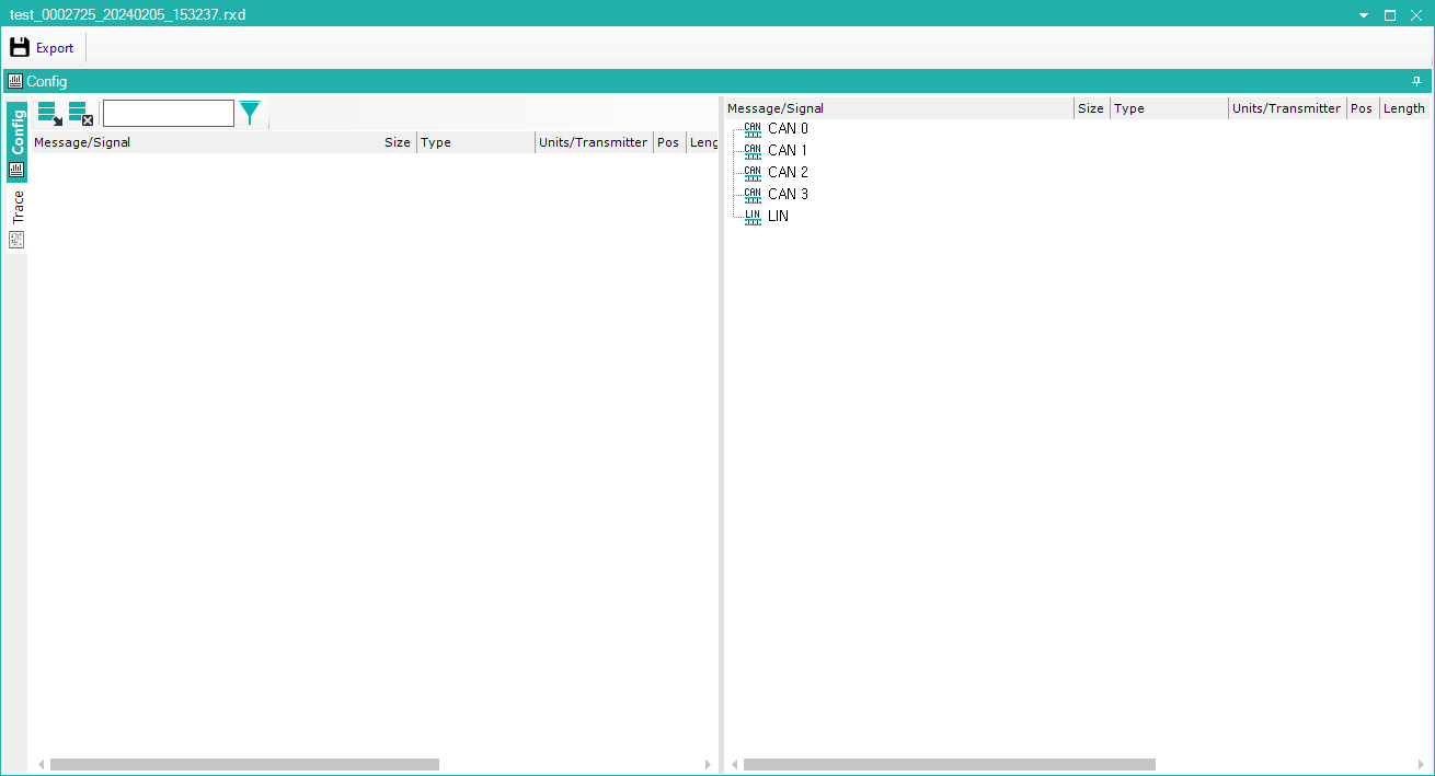 9. Show datalog를 클릭 후 아래와 같이 DBC를 입력합니다. 이번 실습은 단순 랜덤 캔 신호이므로 Export를 통해 asc로 추출합니다.