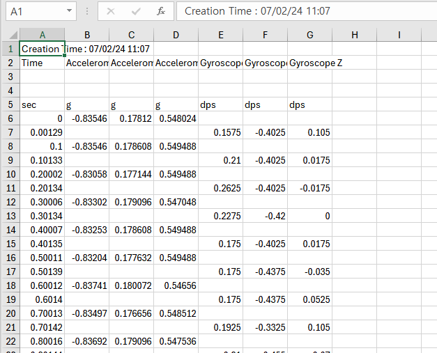 4. 아래와 같이 가속도 값과 자이로 값이 약 100ms 간격으로 들어오고 있음을 알 수 있습니다.