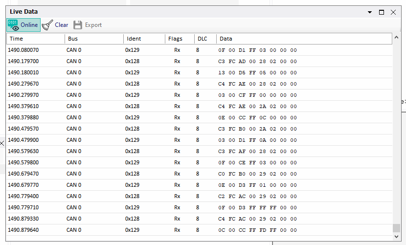2. 장비를 일정 시간 동작 시키면 아래와 같이 SD 카드에 캔 메세지가 저장됩니다. 해당 메세지는 Live를 통해 실시간으로 확인이 가능 합니다.